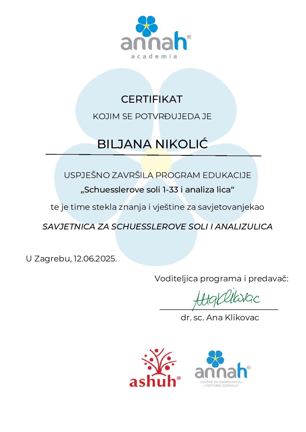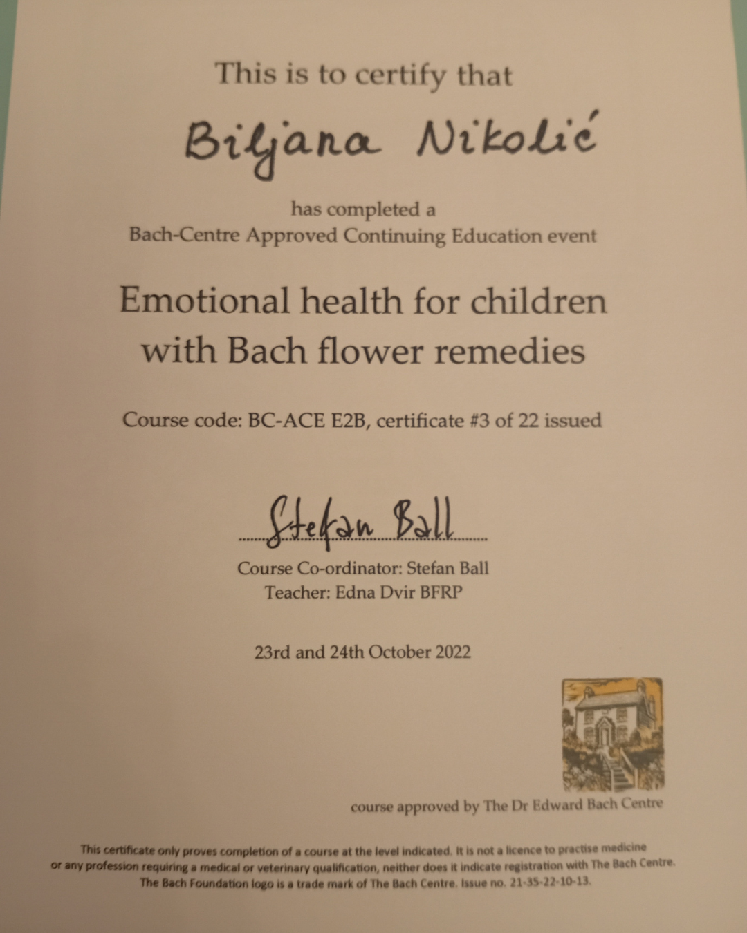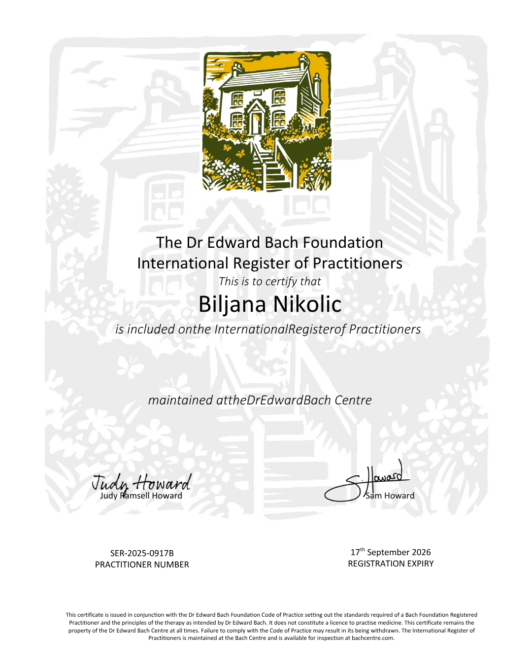 • BFRP – međunarodno licencirani Bahov praktičar, član Internacionalnog udruženja Bahovih praktičara u Engleskoj